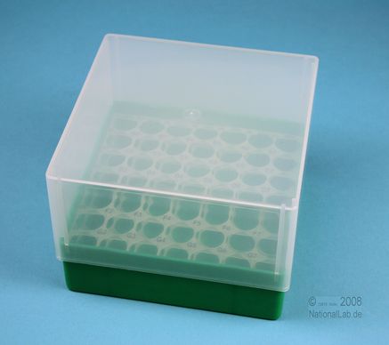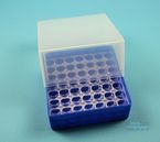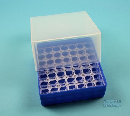 EPPi® Box 95 / 7x7 Löcher, Höhe 95 mm fix. Innenhöhe 93 mm, 7x7 Löcher für 49 Röhrchen bis 16,5 mm Ø. Mit alpha-numerischer Codierung an den Löchern, PP.