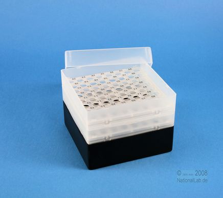 EPPi® Box 105 / 8x8 Löcher, Höhe 105 mm fix. Innenhöhe 103 mm. 8x8 Löcher für 64 Röhrchen bis 11 mm Ø. Mit alpha-numerischer Codierung an den Löchern, PP.