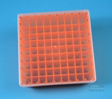 EPPi® Box 50 / 9x9 Fächer, Höhe 52 mm fix. Innenhöhe 50 mm. 9x9 Fächer für 81 Röhrchen bis 12,5 mm Ø. Mit alpha-numerischer Fachcodierung auf allen 4 Seitenrändern sowie auf dem Boden (durchscheinend), PP. (Siehe auch KEC45).