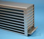 Mikrotiter Schrankeinschübe für Mikrotiterplatten bis 86x128x18 mm, Edelstahl, offene Bauform, Griffleiste, mit Auszugstop, Böden der Schubladen geschlossen