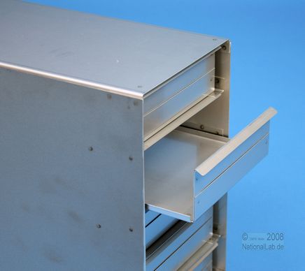 Mikrotiter Schrankeinschübe für Mikrotiterplatten bis 86x128x45 mm, Edelstahl, geschlossene Bauform, Griffleiste, mit Auszugstop, Böden der Schubladen geschlossen