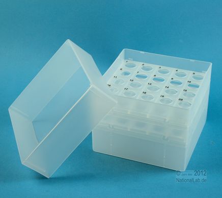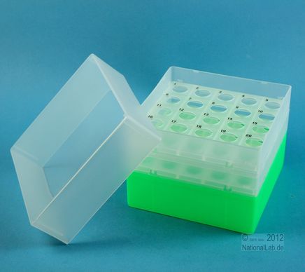 EPPi® Box 128 / 5x5 Löcher, Höhe 128 mm fix. Innenhöhe 125 mm. Für 25 Zentrifugenröhrchen 15 ml (bis 17 mm Ø). Mit numerischer Fachcodierung (1-25) auf dem Locheinsatz, PP