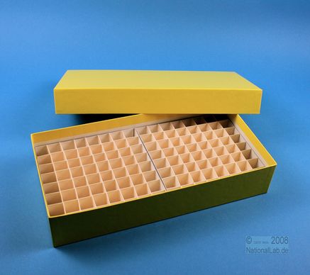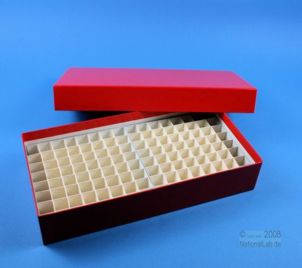 Einfrier- und Lagerboxen. Standardausführung aus tiefkältebeständigem, wasserfest bezogenem Kartonmaterial. Ausführung >spezial< mit wasserdichter Kunststoffbeschichtung. Mit Deckel. Außenmaße 136 x 268 mm. Höhe = Innenhöhe.