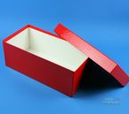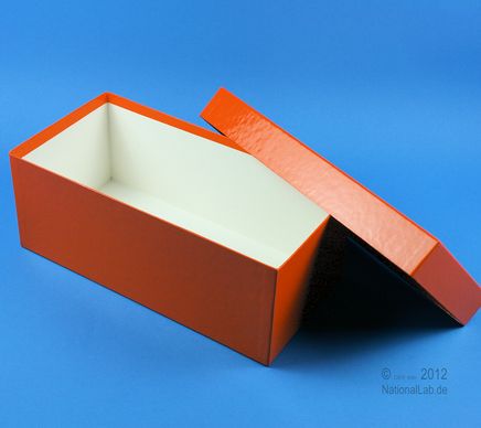 Einfrier- und Lagerboxen. Standardausführung aus tiefkältebeständigem, wasserfest bezogenem Kartonmaterial. Ausführung >spezial< mit wasserdichter Kunststoffbeschichtung. Mit Deckel. Außenmaße 136 x 268 mm. Höhe = Innenhöhe.