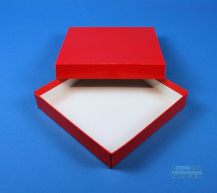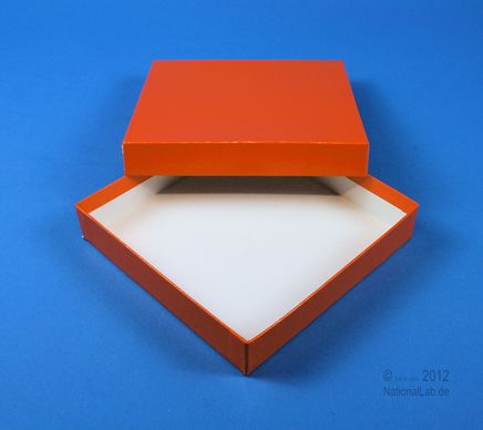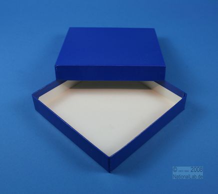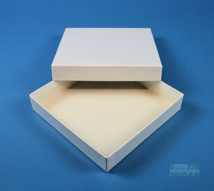 Einfrier- und Lagerboxen. Standardausführung aus tiefkältebeständigem, wasserfest bezogenem Kartonmaterial. Ausführung >spezial< mit wasserdichter Kunststoffbeschichtung. Mit Deckel. Außenmaße 133 x 133 mm. Höhe = Innenhöhe.
