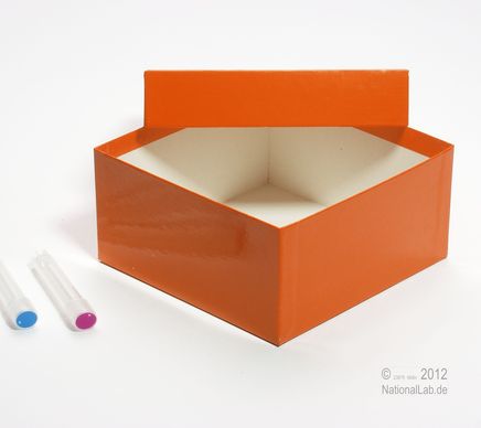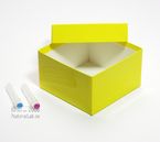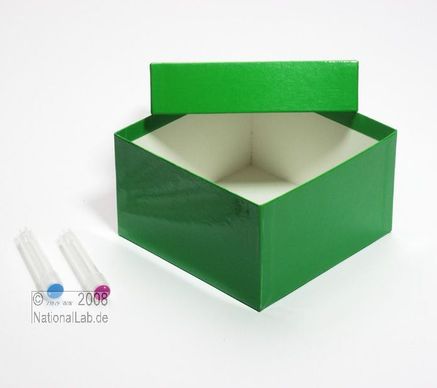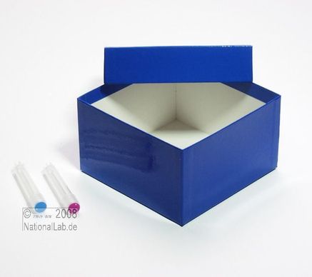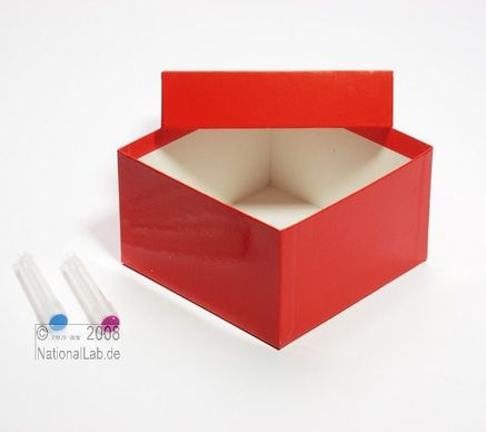 Einfrier- und Lagerboxen. Standardausführung aus tiefkältebeständigem, wasserfest bezogenem Kartonmaterial. Ausführung >spezial< mit wasserdichter Kunststoffbeschichtung. Mit Deckel. Außenmaße 133 x 133 mm. Höhe = Innenhöhe.
