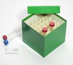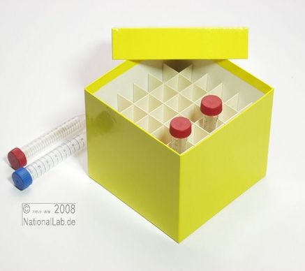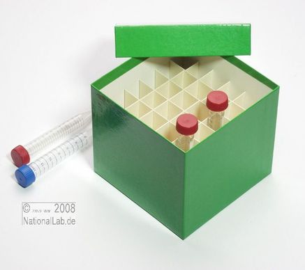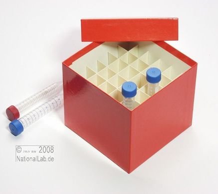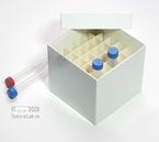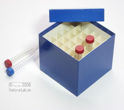 Einfrier- und Lagerboxen für 15 ml und 50 ml Röhrchen. Geeignet für alle Röhrchen mit einem ø bis ca. 22 mm (15 ml) oder 34 mm (50 ml) und einer Länge von max. 125 mm. Standardausführung aus tiefkältebeständigem, wasserfest bezogenem Kartonmaterial. Ausführung >spezial< mit wasserdichter Kunststoffbeschichtung. Mit und ohne eingelegtem Rastereinsatz. Maße = Außenmaße inkl. Deckel.