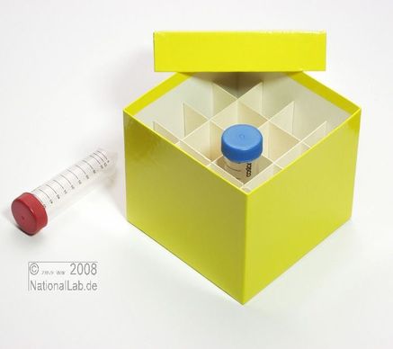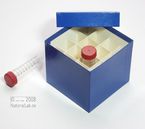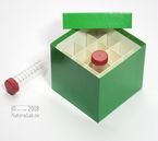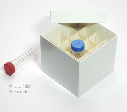 Einfrier- und Lagerboxen für 15 ml und 50 ml Röhrchen. Geeignet für alle Röhrchen mit einem ø bis ca. 22 mm (15 ml) oder 34 mm (50 ml) und einer Länge von max. 125 mm. Standardausführung aus tiefkältebeständigem, wasserfest bezogenem Kartonmaterial. Ausführung >spezial< mit wasserdichter Kunststoffbeschichtung. Mit und ohne eingelegtem Rastereinsatz. Maße = Außenmaße inkl. Deckel.