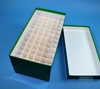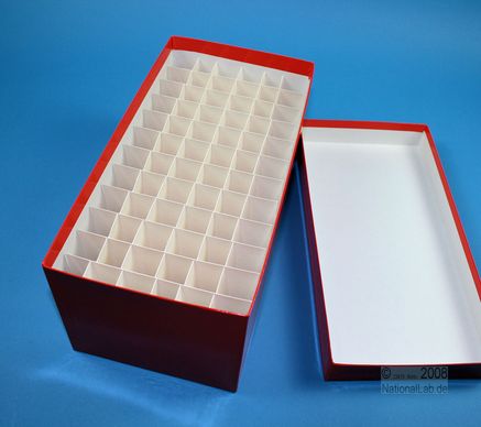 Einfrier- und Lagerboxen für 15 ml und 50 ml Röhrchen. Geeignet für alle Röhrchen mit einem ø bis ca. 22 mm (15 ml) oder 34 mm (50 ml) und einer Länge von max. 125 mm. Standardausführung aus tiefkältebeständigem, wasserfest bezogenem Kartonmaterial. Ausführung >spezial< mit wasserdichter Kunststoffbeschichtung. Mit und ohne eingelegtem Rastereinsatz. Maße = Außenmaße inkl. Deckel.