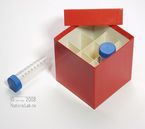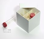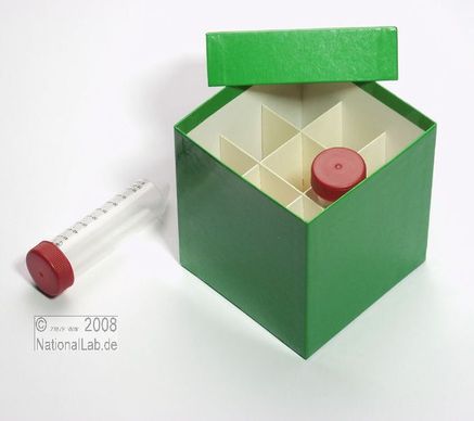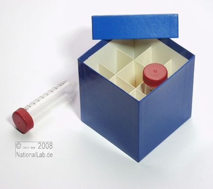 Einfrier- und Lagerboxen für 15 ml und 50 ml Röhrchen. Geeignet für alle Röhrchen mit einem ø bis ca. 22 mm (15 ml) oder 34 mm (50 ml) und einer Länge von max. 125 mm. Standardausführung aus tiefkältebeständigem, wasserfest bezogenem Kartonmaterial. Ausführung >spezial< mit wasserdichter Kunststoffbeschichtung. Mit und ohne eingelegtem Rastereinsatz. Maße = Außenmaße inkl. Deckel.