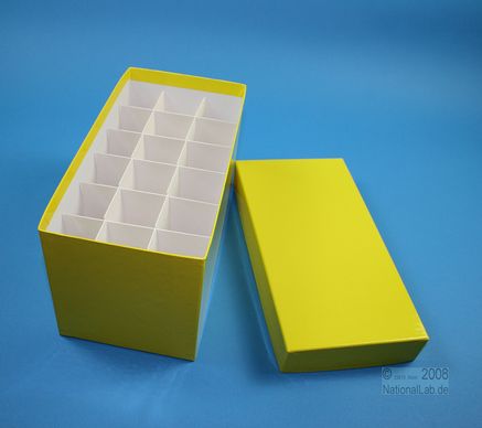 Einfrier- und Lagerboxen für 15 ml und 50 ml Röhrchen. Geeignet für alle Röhrchen mit einem ø bis ca. 22 mm (15 ml) oder 34 mm (50 ml) und einer Länge von max. 125 mm. Standardausführung aus tiefkältebeständigem, wasserfest bezogenem Kartonmaterial. Ausführung >spezial< mit wasserdichter Kunststoffbeschichtung. Mit und ohne eingelegtem Rastereinsatz. Maße = Außenmaße inkl. Deckel.