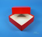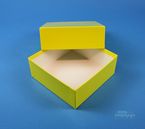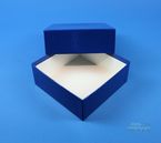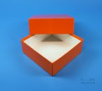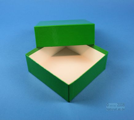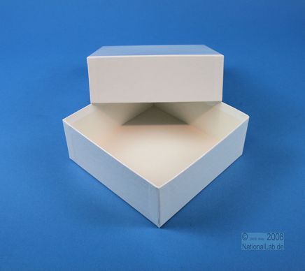 Einfrier- und Lagerboxen. Standardausführung aus tiefkältebeständigem, wasserfest bezogenem Kartonmaterial. Ausführung >spezial< mit wasserdichter Kunststoffbeschichtung. Mit verlängertem Deckel. Außenmaße 133 x 133 mm. Höhe = Innenhöhe.