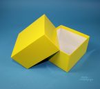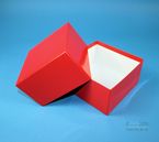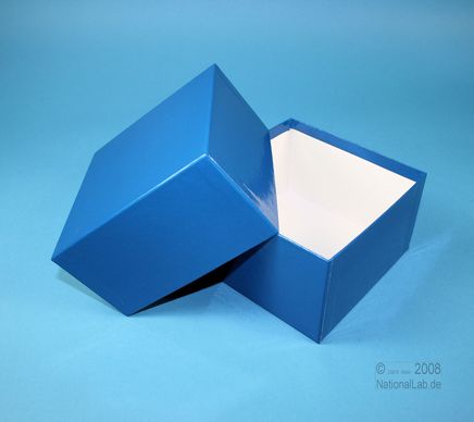 Einfrier- und Lagerboxen. Standardausführung aus tiefkältebeständigem, wasserfest bezogenem Kartonmaterial. Ausführung >spezial< mit wasserdichter Kunststoffbeschichtung. Mit verlängertem Deckel. Außenmaße 133 x 133 mm. Höhe = Innenhöhe.