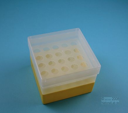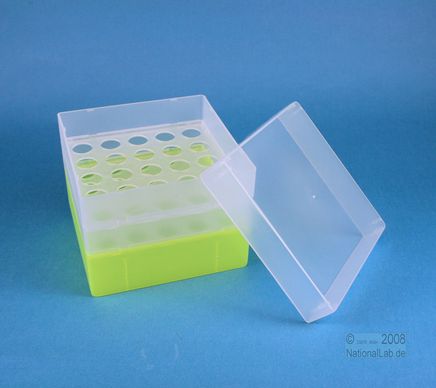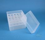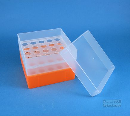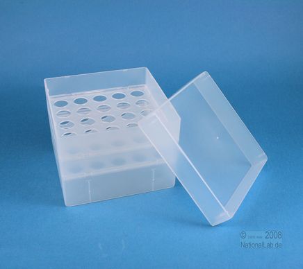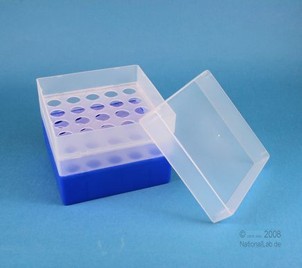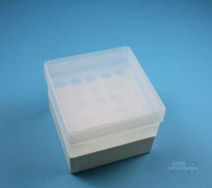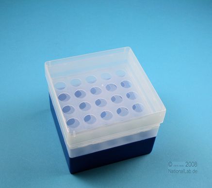 EPPi® Box 105 / 5x5 Löcher, Höhe 105 mm fix. Innenhöhe 103 mm. Für 25 Röhrchen bis 17 mm Ø. Zum Beispiel für Kulturröhrchen 14 ml. Ohne Fachcodierung, PP.
