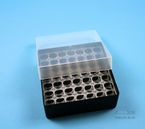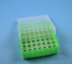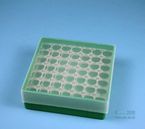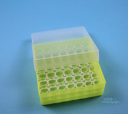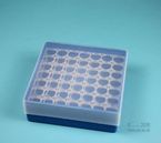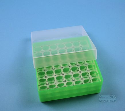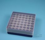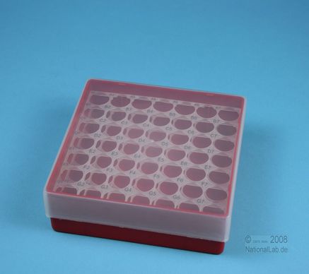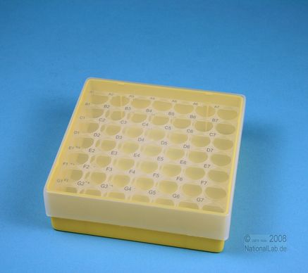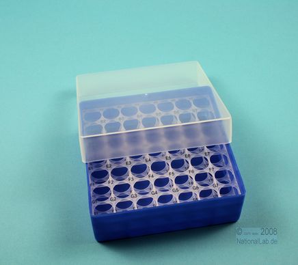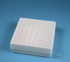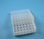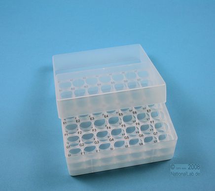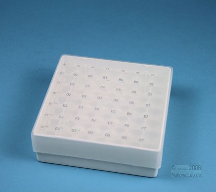 EPPi® Box 45 / 7x7 Löcher, Höhe 45-53 mm variabel. 7x7 Löcher für 49 Röhrchen bis 16,5 mm Ø. Mit alpha-numerischer Codierung an den Löchern, PP. (Siehe auch KEB50).