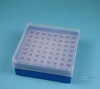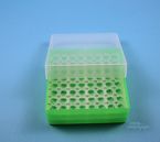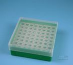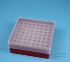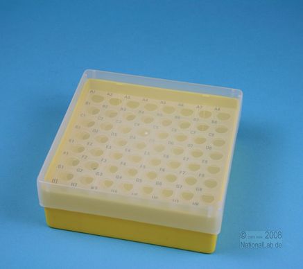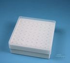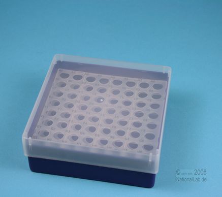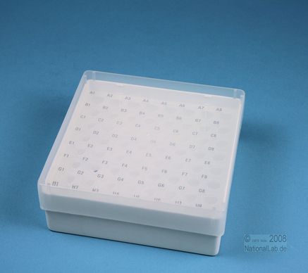 EPPi® Box 50 / 8x8 Löcher, Höhe 52 mm fix. Innenhöhe 50 mm. 8x8 Löcher für 64 Reaktionsgefäße 1,5 ml und 2,0 ml Safe-Lock® bis 11 mm Ø. Mit alpha-numerischer Codierung an den Löchern, PP. (Siehe auch KEB45).