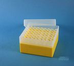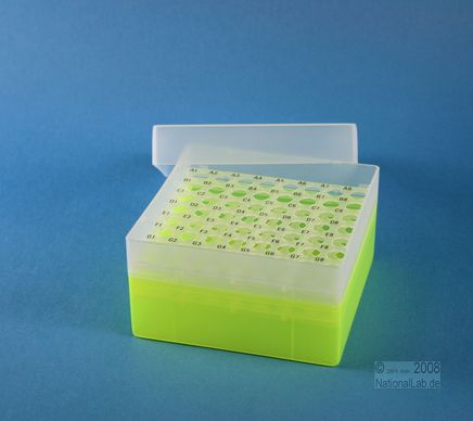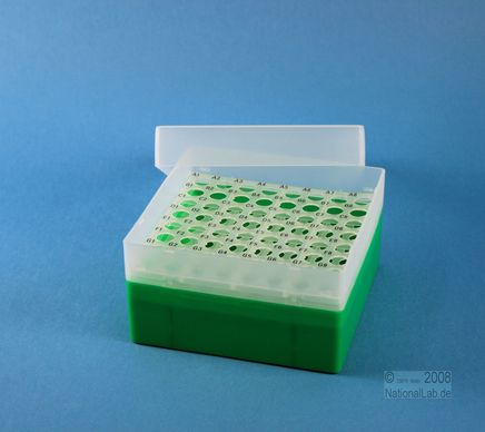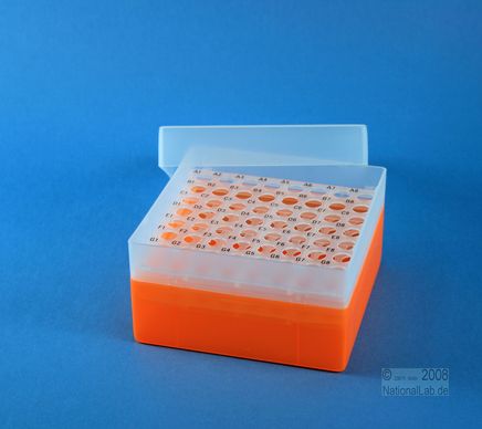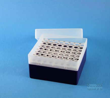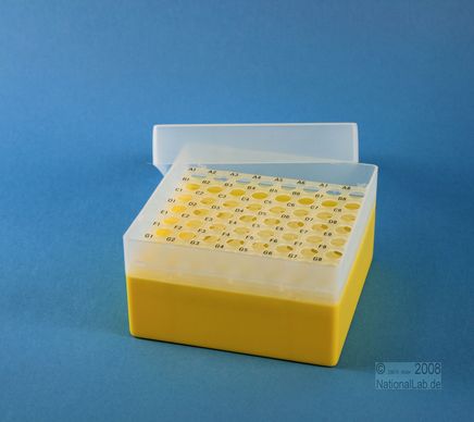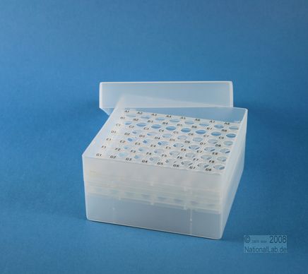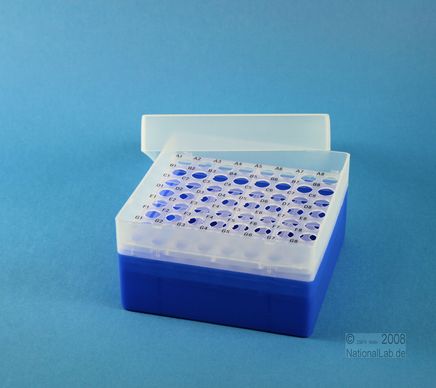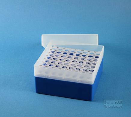 | EPPiŽ Box 70 / 8x8 holes, Height 70-80 mm variable. 8x8 holes for 64 vials up to 11 mm diameter. With alphanumeric ID code by the holes, PP. |