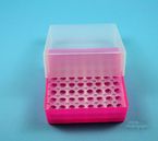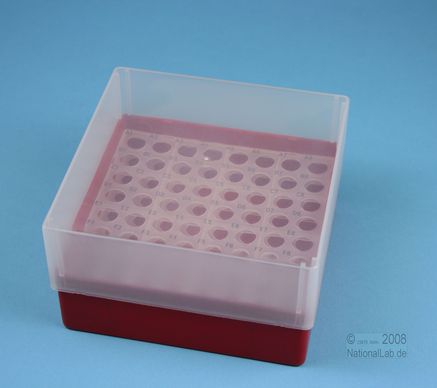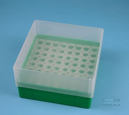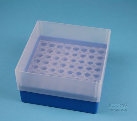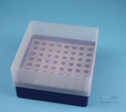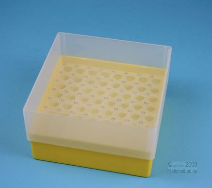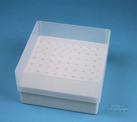 EPPi® Box 75 / 8x8 Löcher, Höhe 75 mm fix. Innenhöhe 73 mm. 8x8 Löcher für 64 Röhrchen bis 11 mm Ø. Mit alpha-numerischer Codierung an den Löchern, PP.