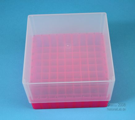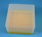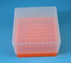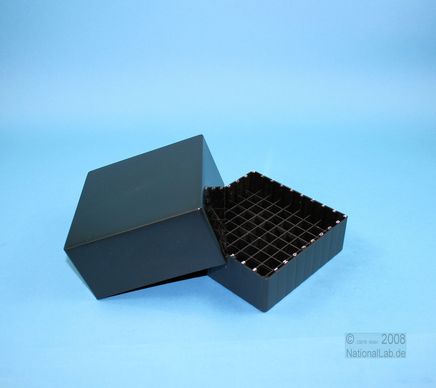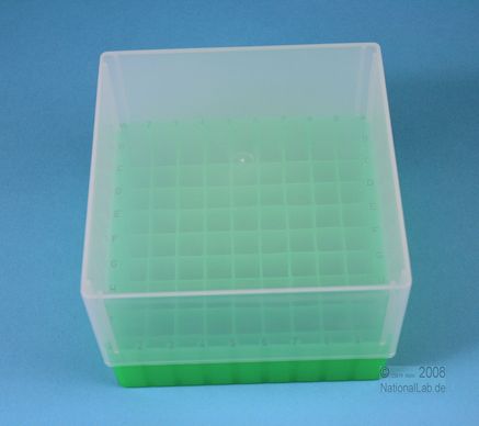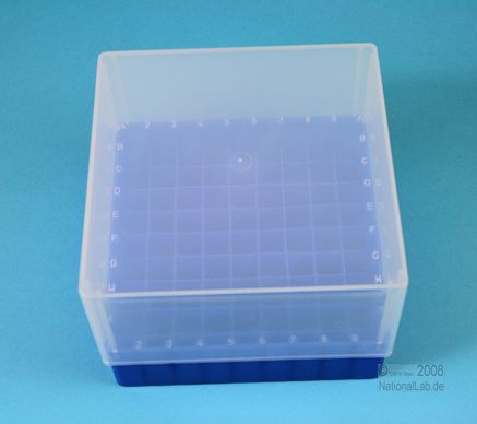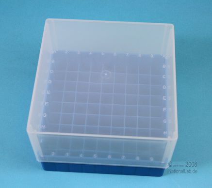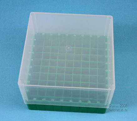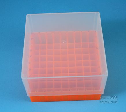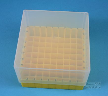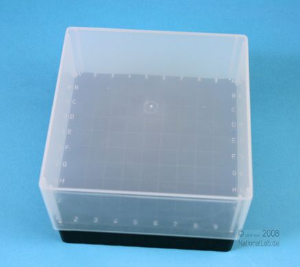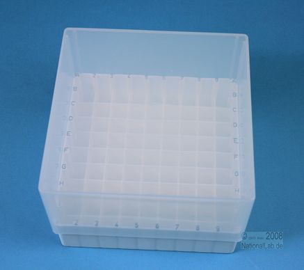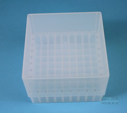 EPPiŽ Box 95 / 9x9 dividers, Height 95 mm fix. Inner height 93 mm, 9x9 dividers for 81 vials up to 12,5 mm diameter. With alphanumeric ID code on all 4 sides, PP. Such as for 5 ml Kryo vials.