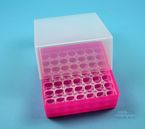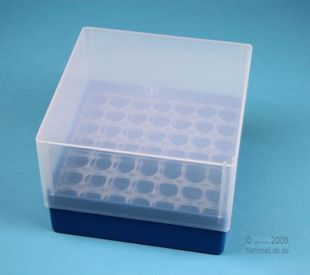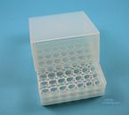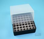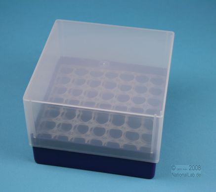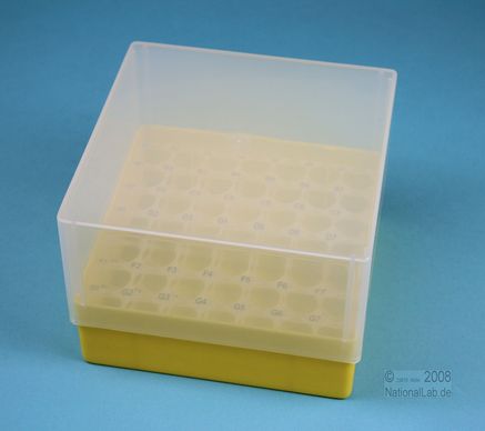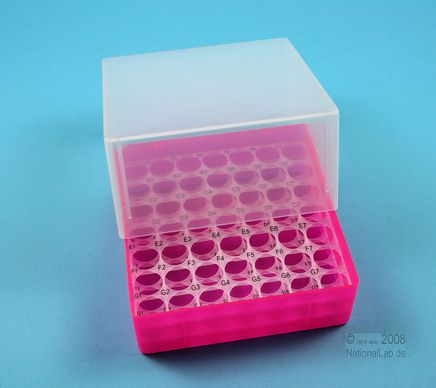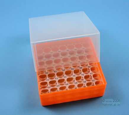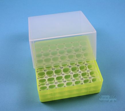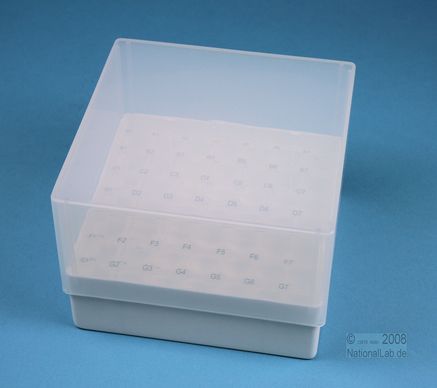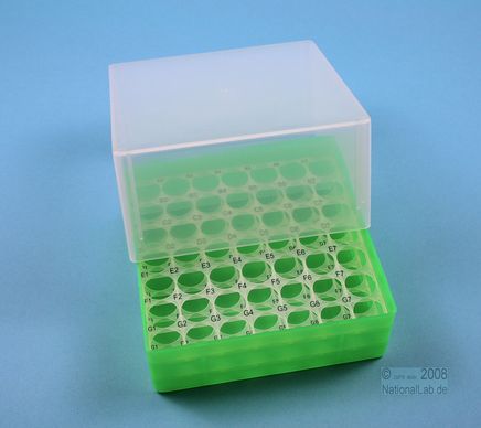 EPPi® Box 95 / 7x7 Löcher, Höhe 95 mm fix. Innenhöhe 93 mm, 7x7 Löcher für 49 Röhrchen bis 16,5 mm Ø. Mit alpha-numerischer Codierung an den Löchern, PP.