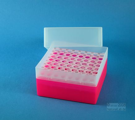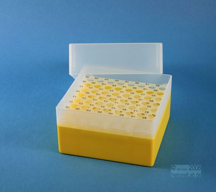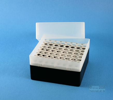 EPPi® Box 102 / 8x8 Löcher, Höhe 102 mm fix. Innenhöhe 100 mm. 8x8 Löcher für 64 Röhrchen bis 11 mm Ø. Mit alpha-numerischer Codierung an den Löchern, PP.