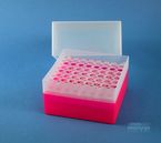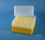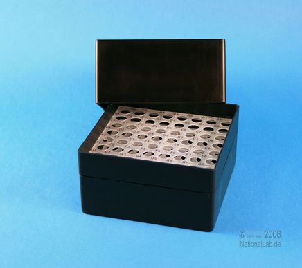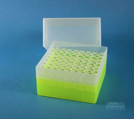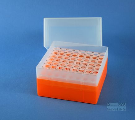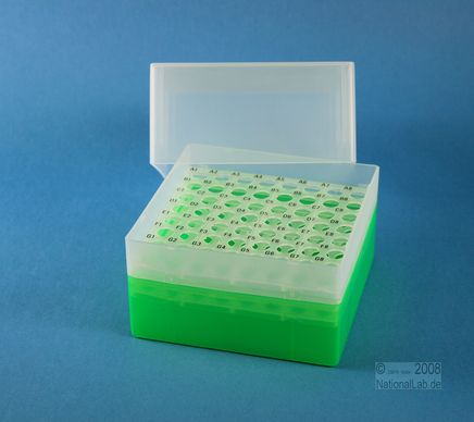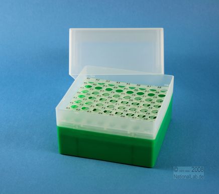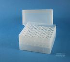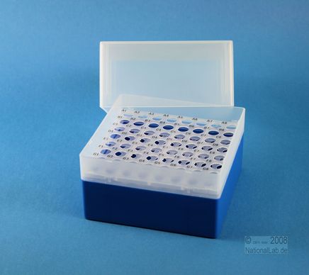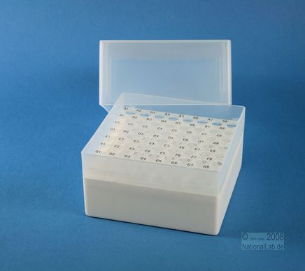 EPPi® Box 122 / 8x8 Löcher, Höhe 122 mm fix. Innenhöhe 118 mm. 8x8 Löcher für 64 Röhrchen bis 11 mm Ø. Mit alpha-numerischer Codierung an den Löchern, PP.