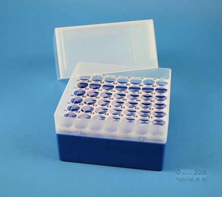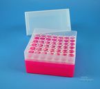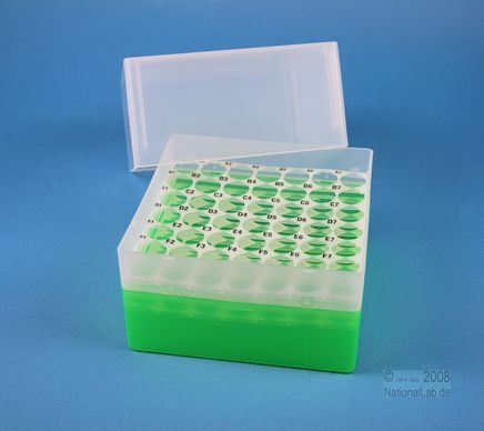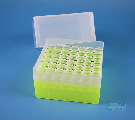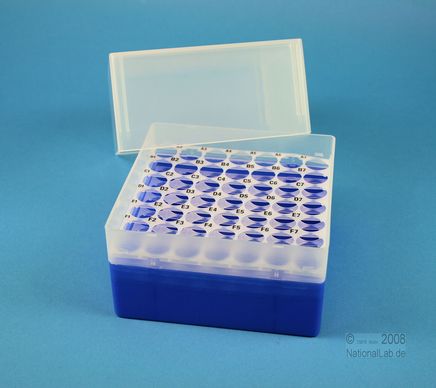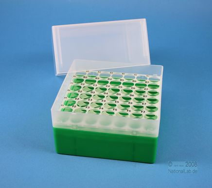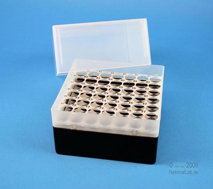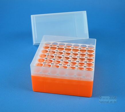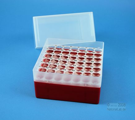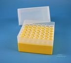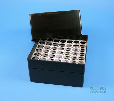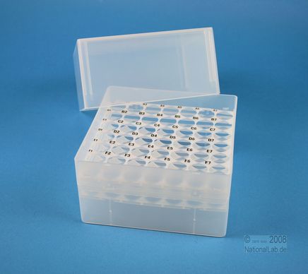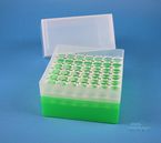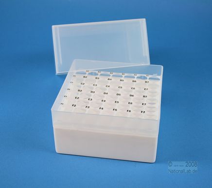 EPPi® Box 122 / 7x7 Löcher, Höhe 122 mm fix. Innenhöhe 118 mm. 7x7 Löcher für 49 Röhrchen bis 16,5 mm Ø. Mit alpha-numerischer Codierung an den Löchern, PP.