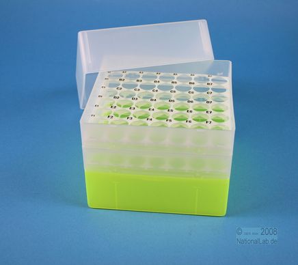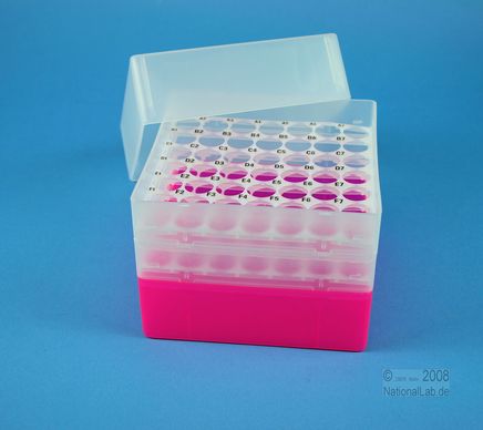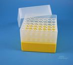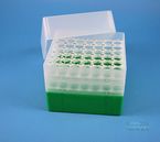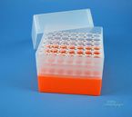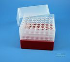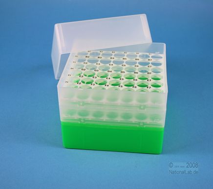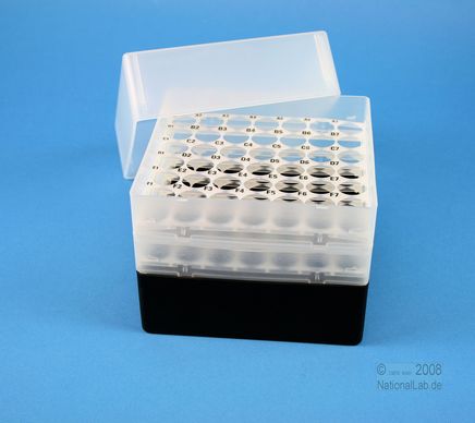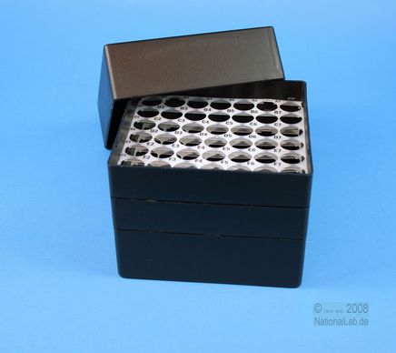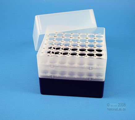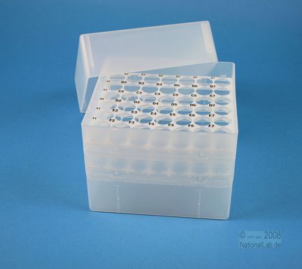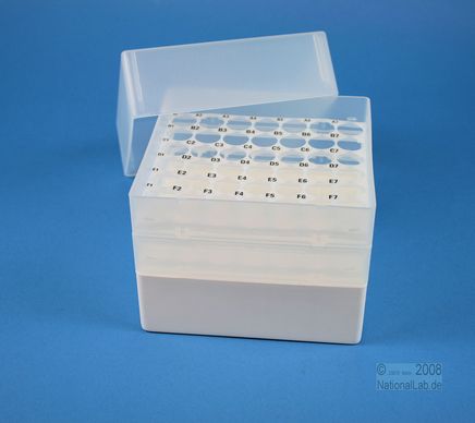 EPPi® Box 128 / 7x7 Löcher, Höhe 128 mm fix. Innenhöhe 125 mm. 7x7 Löcher für 49 Röhrchen bis 16,5 mm Ø. Mit alpha-numerischer Codierung an den Löchern, PP.