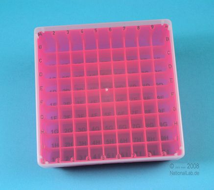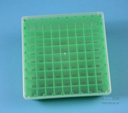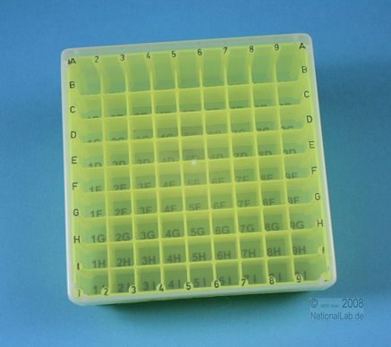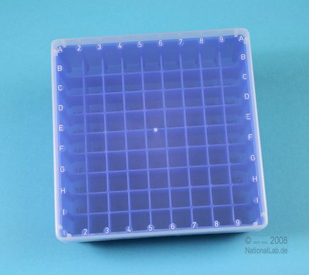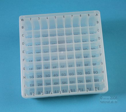 EPPi® Box 50 / 9x9 Fächer, Höhe 52 mm fix. Innenhöhe 50 mm. 9x9 Fächer für 81 Röhrchen bis 12,5 mm Ø. Mit alpha-numerischer Fachcodierung auf allen 4 Seitenrändern sowie auf dem Boden (durchscheinend), PP. (Siehe auch KEC45).