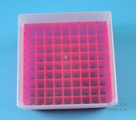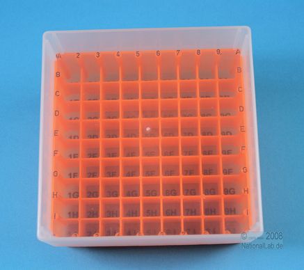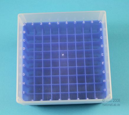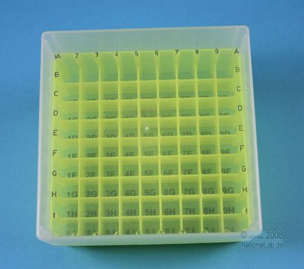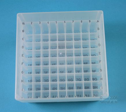 EPPiŽ Box 75 / 9x9 dividers, Height 75 mm fix. Inner height 73 mm. 9x9 dividers for 81 vials up to 12,5 mm diameter. With alphanumeric ID code on all 4 sides as well as on the bottom of the box (transparent), PP.