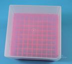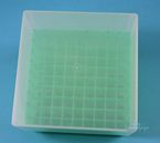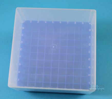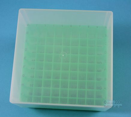 EPPiŽ Box 95 / 9x9 dividers, Height 95 mm fix. Inner height 93 mm. 9x9 dividers for 81 vials up to 12,5 mm diameter. With alphanumeric ID code on all 4 sides as well as on the bottom of the box (transparent), PP. Such as for 5 ml Kryo vials.