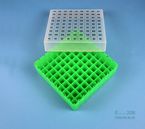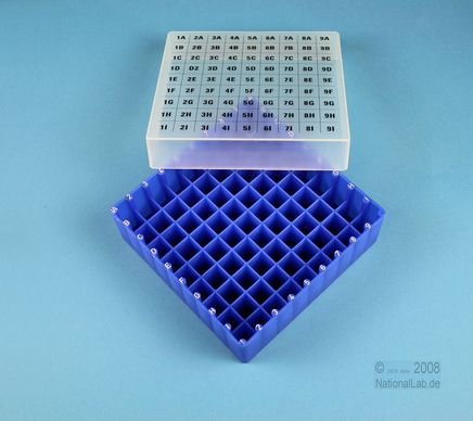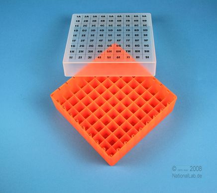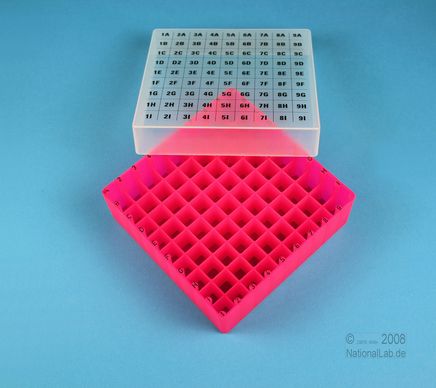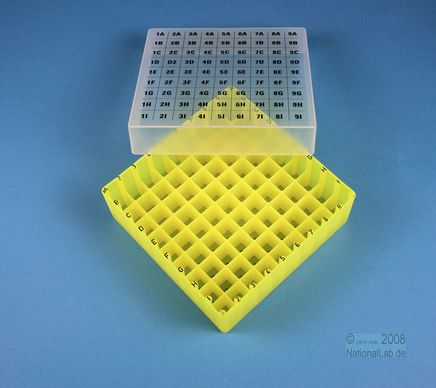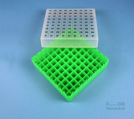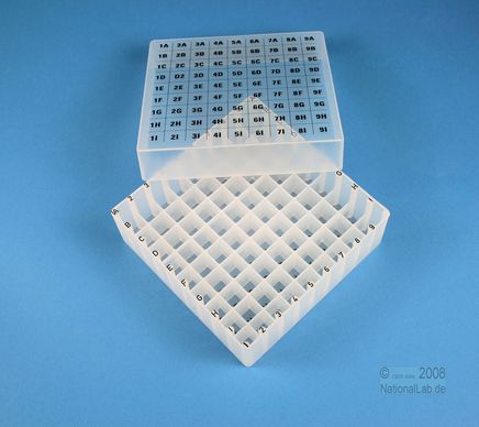 EPPi® Box 45 / 9x9 Fächer, Höhe 45-53 mm variabel. 9x9 Fächer für 81 Röhrchen bis 12,5 mm Ø. Mit alpha-numerischer Fachcodierung auf allen 4 Seitenrändern sowie auf dem Boden (durchscheinend) und auf dem Deckel, PP. (Siehe auch KEE50).