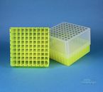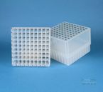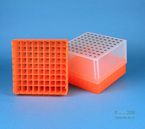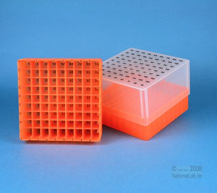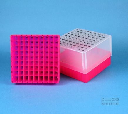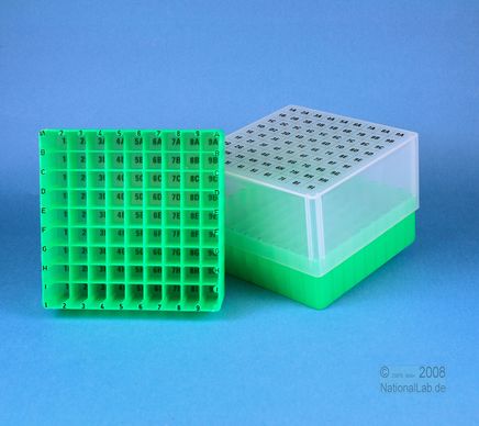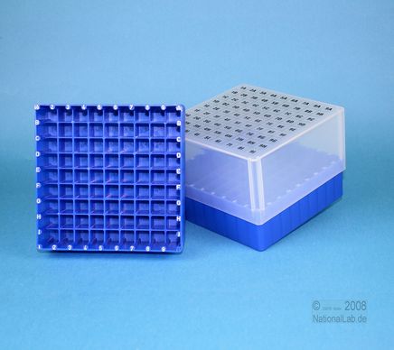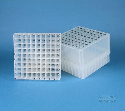 EPPiŽ Box 95 / 9x9 dividers, Height 95 mm fix. Inner height 93 mm. 9x9 dividers for 81 vials up to 12,5 mm diameter. With alphanumeric ID code on all 4 sides as well as on the bottom of the box (transparent) and on the lid, PP. Such as for 5 ml Kryo vials.