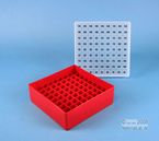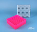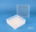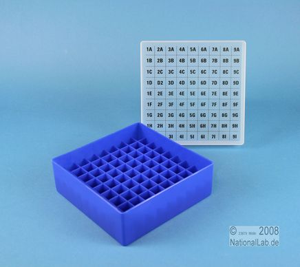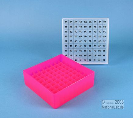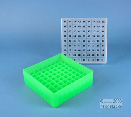 EPPi® Box 50 / 9x9 Fächer, Höhe 52 mm fix. Innenhöhe 50 mm. 9x9 Fächer für 81 Röhrchen bis 12,5 mm Ø. Mit alpha-numerischer Fachcodierung auf dem Deckel, PP. (Siehe auch KEH45).