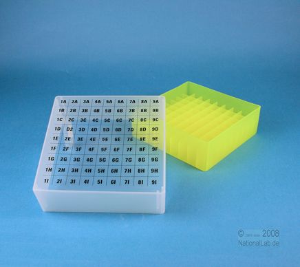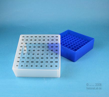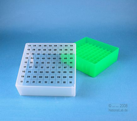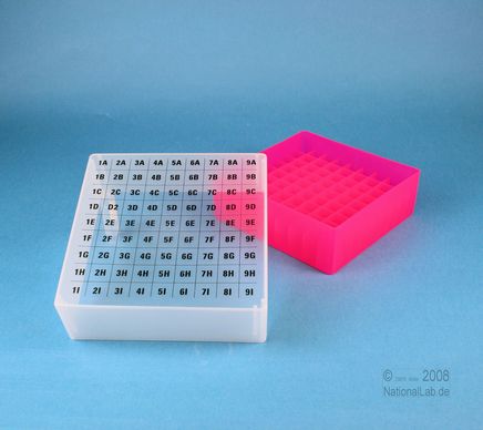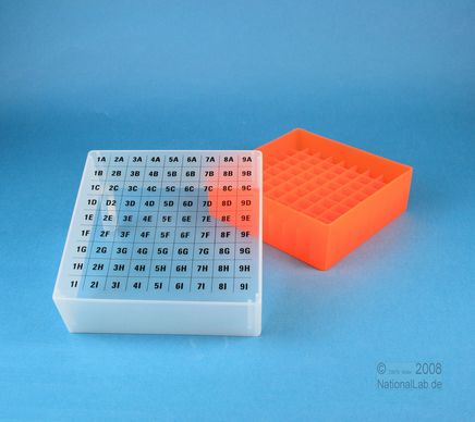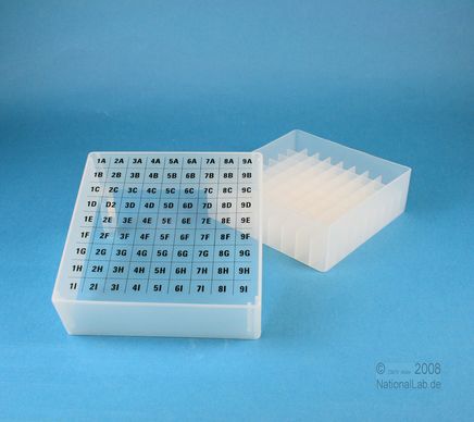 EPPiŽ Box 75 / 9x9 dividers, Height 75 mm fix. Inner height 73 mm. 9x9 dividers for 81 vials up to 12,5 mm diameter. With alphanumeric ID code on the lid, PP.
