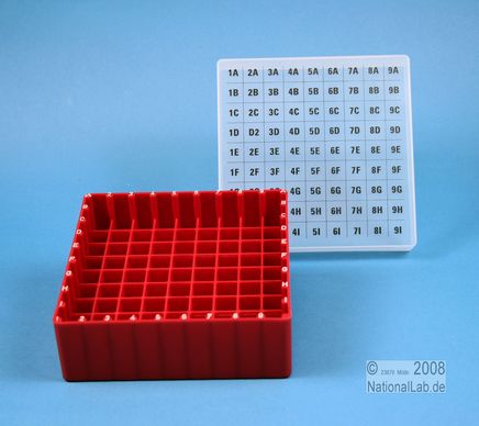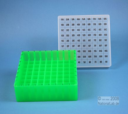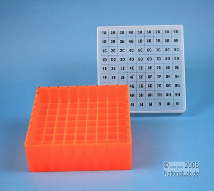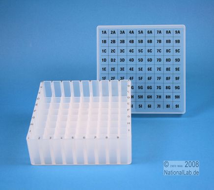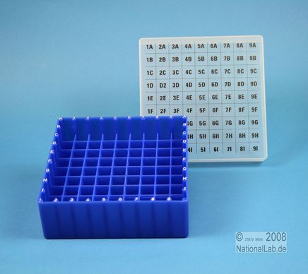 EPPi® Box 45 / 9x9 Fächer, Höhe 45-53 mm variabel. 9x9 Fächer für 81 Röhrchen bis 12,5 mm Ø. Mit alpha-numerischer Fachcodierung auf allen 4 Seitenrändern sowie auf dem Deckel, PP. (Siehe auch KEK50).