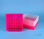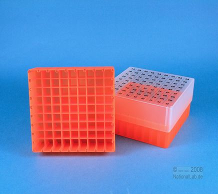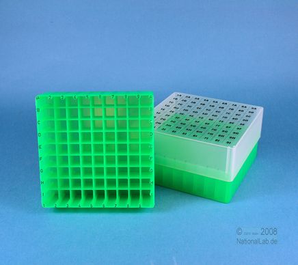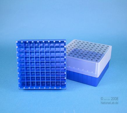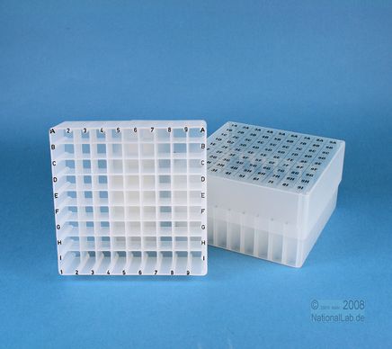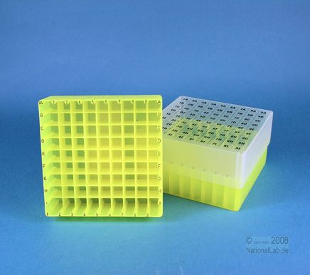 EPPi® Box 75 / 9x9 Fächer, Höhe 75 mm fix. Innenhöhe 73 mm. 9x9 Fächer für 81 Röhrchen bis 12,5 mm Ø. Mit alpha-numerischer Fachcodierung auf allen 4 Seitenrändern sowie auf dem Deckel, PP.