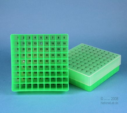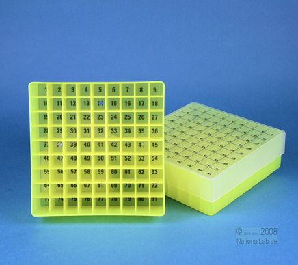 EPPi® Box 45 / 9x9 Fächer, Höhe 45-53 mm variabel. 9x9 Fächer für 81 Röhrchen bis 12,5 mm Ø. Mit numerischer Fachcodierung (1-81) auf dem Boden (durchscheinend) und auf dem Deckel, PP. (Siehe auch KER50).