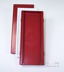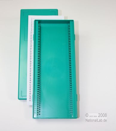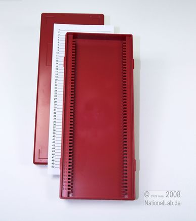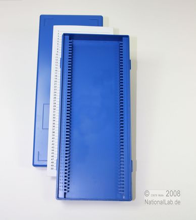 Obi Slide Box 50 / 50 dividers, Height 35 mm fix. With index card and numbering in lower section. For slides 76x26 mm. Polysterene. External dimensions (WxDxH): 100x230x35 mm