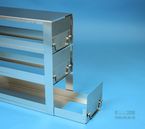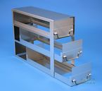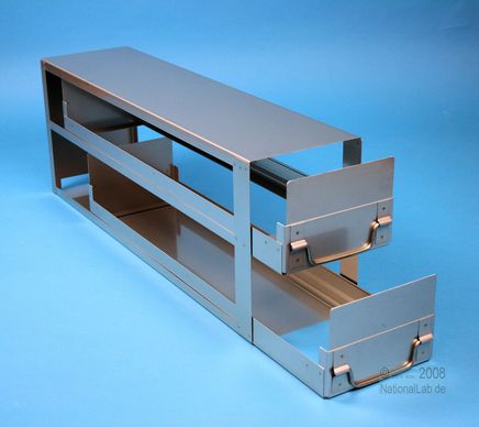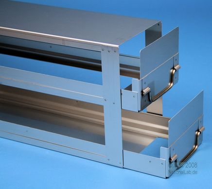 ALPHA 100 Schrankeinschübe für alle Boxen bis 136x136x103 mm, Edelstahl, offene Bauform, Klappgriff, ohne Auszugstop, Böden der Schubladen offen. Erleichtert das Herausnehmen und Einsetzen. Front geschlossen