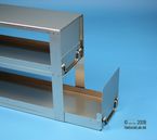 BRAVO 130 Schrankeinschübe für alle Boxen bis 133x133x133 mm, offene Bauform, Klappgriff, mit Auszugstop, Schubladenböden geschlossenBRAVO 130 Schrankeinschübe für alle Boxen bis 133x133x133 mm, Edelstahl, offene Bauform, Klappgriff, mit Auszugstop, Böden der Schubladen geschlossen, Front geschlossen