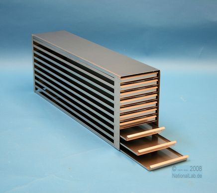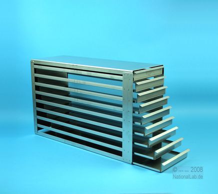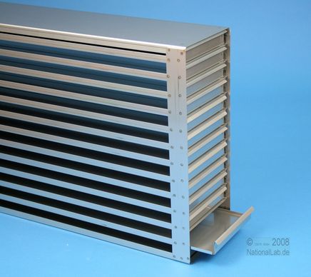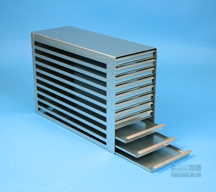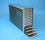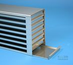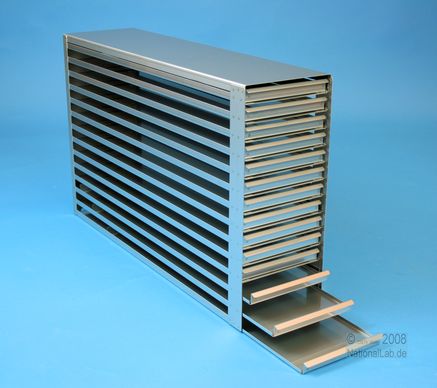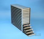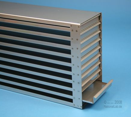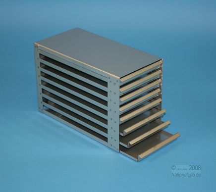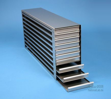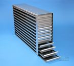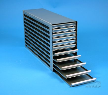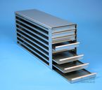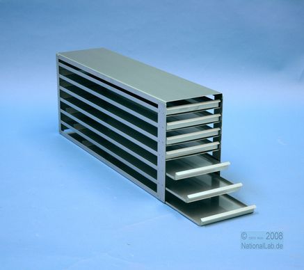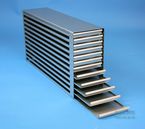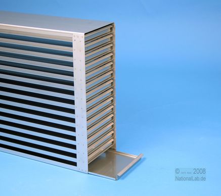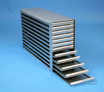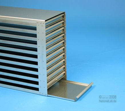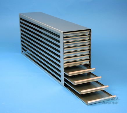 | Microtiter Drawer Racks for Microtiter Plates up to 86x128x18 mm, Stainless steel, Open Design, Grip Rail, with Safety Stop, Base of drawer closed |