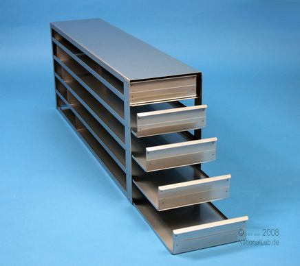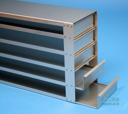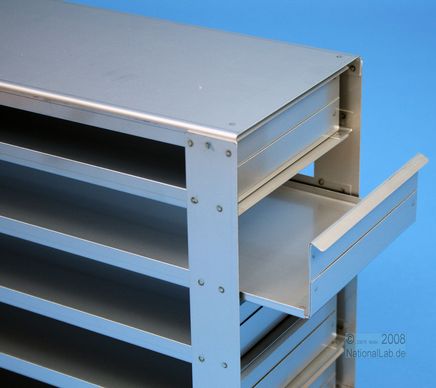 Mikrotiter Schrankeinschübe für Mikrotiterplatten bis 86x128x45 mm, Edelstahl, offene Bauform, Griffleiste, ohne Auszugstop, Böden der Schubladen geschlossen