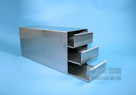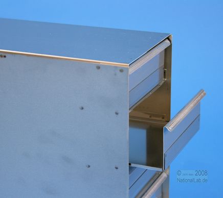 Mikrotiter Schrankeinschübe für Mikrotiterplatten bis 86x128x53 mm, Edelstahl, geschlossene Bauform, Griffleiste, ohne Auszugstop, Böden der Schubladen geschlossen
