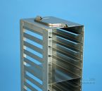 Mikrotiter Truhengestell mit Einzelfächern für Mikrotiterplatten bis 86x128x18 mm, Edelstahl, Klappgriff Für Mikrotiterplatten oder Deep-Well Blöcke aller bekannten Marken. Alle Truhengestelle können auf Wunsch mit einem Sicherungsstab geliefert werden. Dadurch vergrößert sich die Tiefe um 5 mm. Bitte bei Bedarf anfragen.