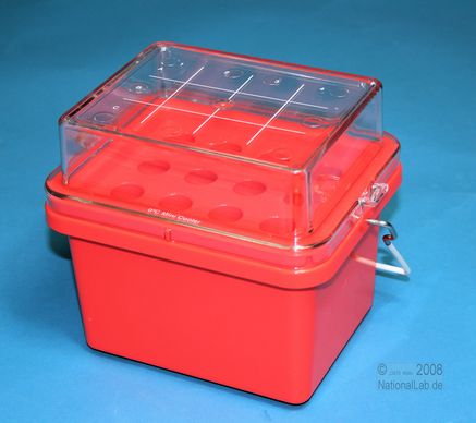 Isotherm Mini Cooler 0°C für Röhrchen ø 12-17 mm, z.B. 15 ml Zentrifugenröhrchen oder Vacutainer 1). Mit alpha-numerischer Codierung auf dem transparenten Deckel. Aus widerstandsfähigem Polycarbonat, gefüllt mit nicht-toxischer Isolierflüssigkeit. Kein direkter Kontakt zwischen den Röhrchen und der Isolierflüssigkeit. Mit rutschfesten Füßen.