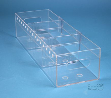 Blutbeutel- und Plasma-Schrankkasten aus stabilem Acrylglas 3 mm, durchsichtig. An den beiden Stirnseiten Grifflöcher. Mit 2 verschiebbaren Trennteilern in der Grundausstattung. Beschriftungsreiter und -karten optional. Kartengröße BxH = 25x50 mm. Modifizierte Ausführungen sind möglich.