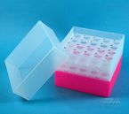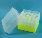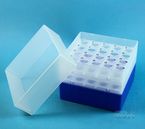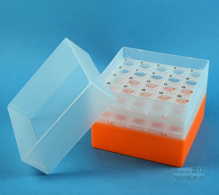 EPPi® Box 128 / 5x5 Löcher, Höhe 128 mm fix. Innenhöhe 125 mm. Für 25 Zentrifugenröhrchen 15 ml (bis 17 mm Ø). Mit numerischer Fachcodierung (1-25) auf dem Locheinsatz, PP