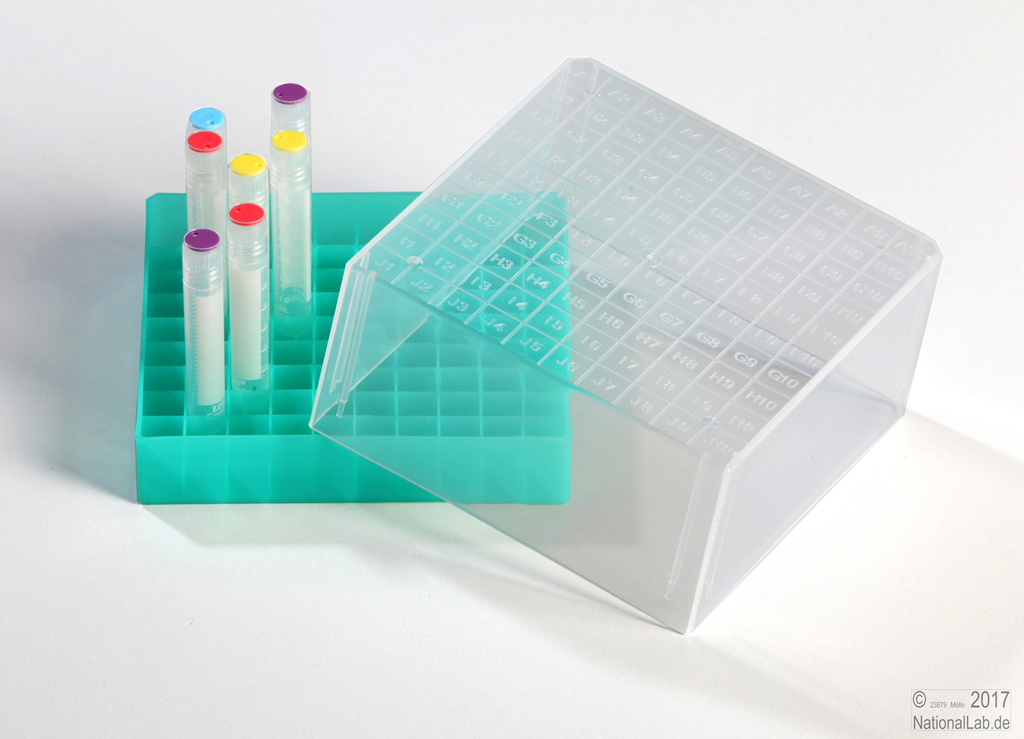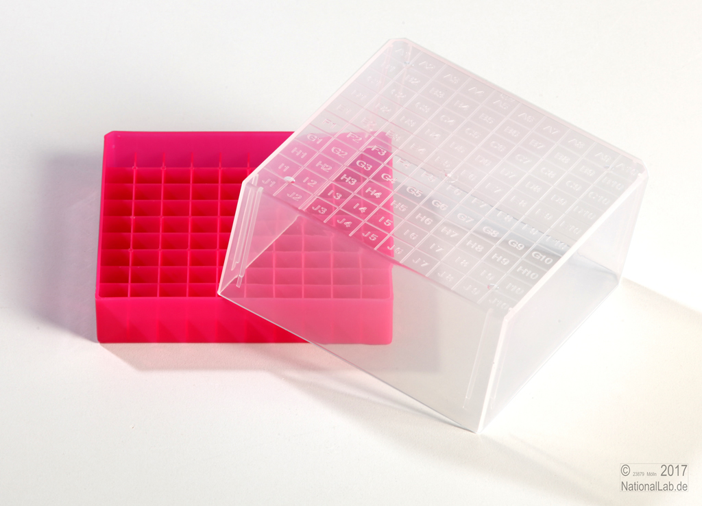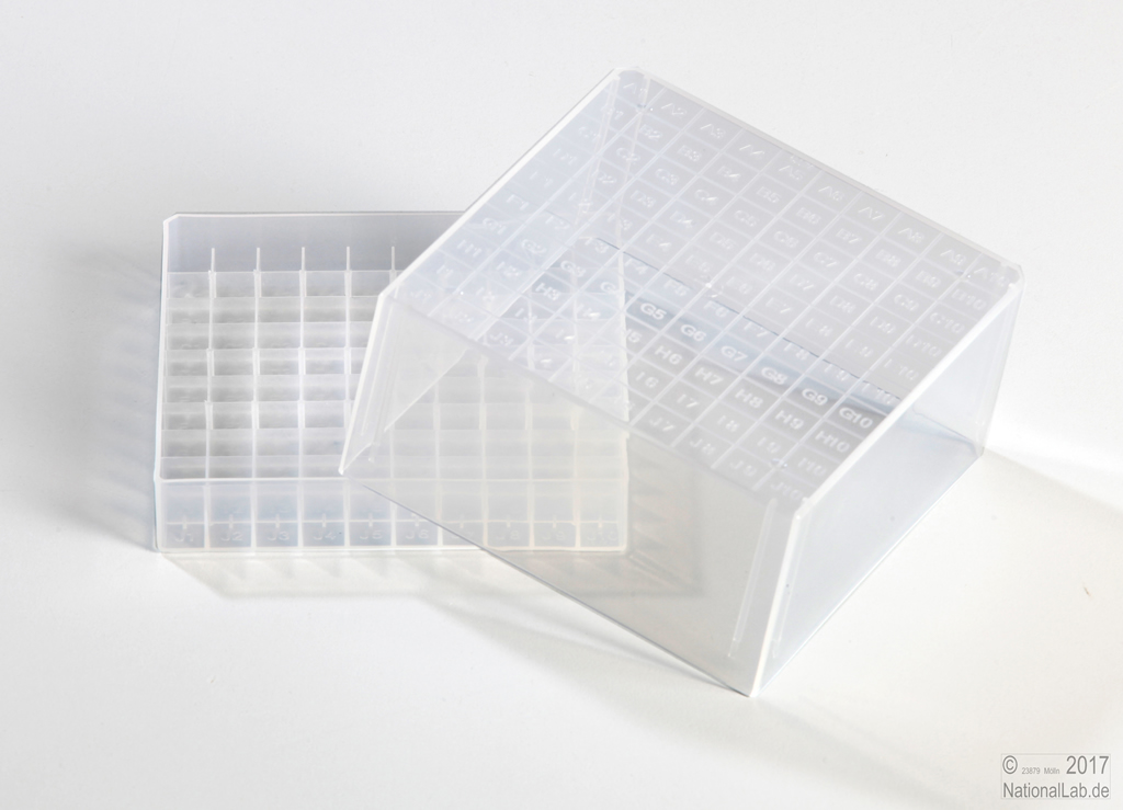 10x10 Fächer für Röhrchen bis 12,3 mm ø. Mit alpha-numerischer Fachcodierung auf dem Deckel und dem Boden. Mit Verdrehsicherung. PP. Geeignet für EPPi® Kryo-Röhrchen.