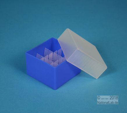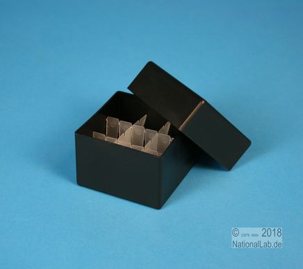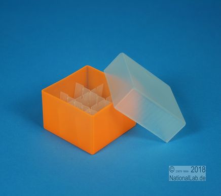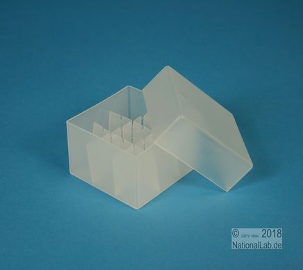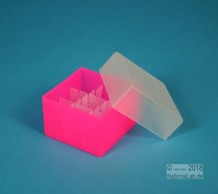 EPPi® Box 45 / 3x3 Fächer, Höhe 45-60 mm variabel. 9 Plätze für Röhrchen bis 20 mm Ø. Herausnehmbarer Rastereinsatz. Außenmaße 67x67 mm. Ohne Fachcodierung, PP